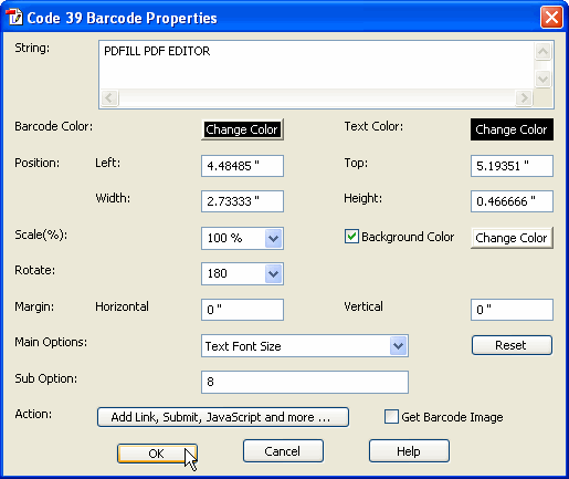 (Horizontal/Vertical)The distance from the barcode to the border of the background. Main Option DOS Command Default Sub Option Text Font Size -fontSize 8.0 Text Base Line Distance -baseline 8.0 Bar Height -barHeight 24.0 Minimum Bar Width -X 0.8 Bar Multiplier for Wide bars -N 2 Generate Check Sum -generateCheckSum 0 FALSE (0) and TRUE (1) Check Sum Text -checkSumText 0 FALSE (0) and TRUE (1) Font Name -fontName Times New Roman Font Style -fontStyle 0 regular(0), bold(1), italic(2), bold and italics(3) Horizontal Alignment -textAlignment 1 left(0), middle (1) and right (2) Text Over the Bar -textOverbar 0 FALSE (0) and TRUE (1) Show the Start Stop Text -startStopText 1 FALSE (0) and TRUE (1) Extended -extended 0 FALSE (0) and TRUE (1) Reset Reset all the Sub Options to the default values Action: Add Link, Submit, JavaScript and more ... See PDF Actions. Get Barcode Image Save the barcode image as a PNG file after clicking OK.