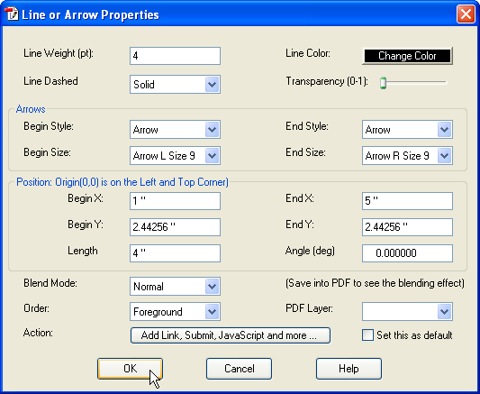 You can use this tool to draw a line or arrow into PDF document. You can change drawingıs Line Width, Dashed Style, Arrow Style, Line Color, Fill Color, Transparency and Layer properties.