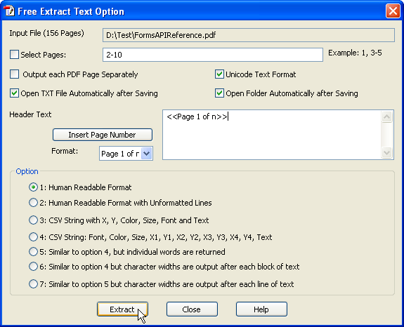 "C:\Program Files\PlotSoft\PDFill\PDFill.exe" ExtractText Input.pdf Output.txt TextOption1to7 UnicodeTextFortmat OutputPageSeparately -SelectPages "1-2" -HeaderText "Test<<Page 1 of n>>"