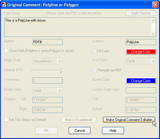 Edit Original Comment by Click or DragYou can select the original comment to edit it: Stamp, Text Box, Sticky Note, Popup, File Attachment, Line or Arrow, Rectangle or Oval, Polyline and Polygon, Cloud, Pencil.